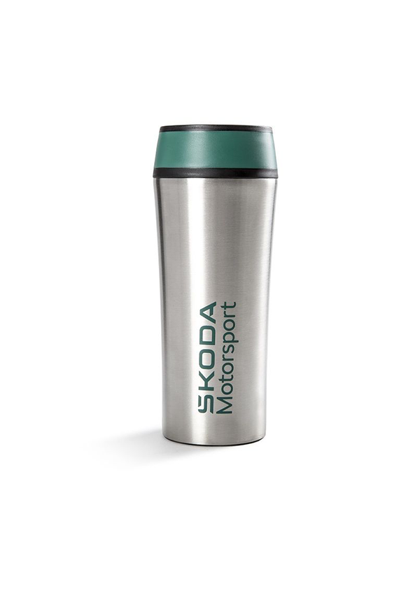 La taza térmica al vacío de doble pared Škoda Motorsport “GoClick” con un inteligente orificio para beber de 360° mantendrá sus bebidas calientes y frías durante largos periodos de tiempo. Está fabricada en acero inoxidable de doble pared, con tapa de rosca de plástico para facilitar el llenado. El cuerpo de la taza es plateado con la impresión Škoda Motorsport verde esmeralda de tamaño 7 x 2,5cm, la tapa de plástico es en combinación de colores verde esmeralda-negro.